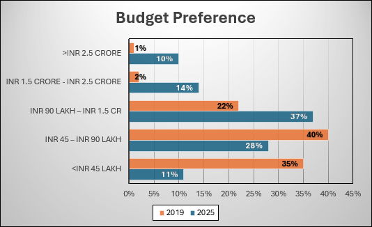 - 2019: Only 25% of women sought homes above INR 90 lakhs.