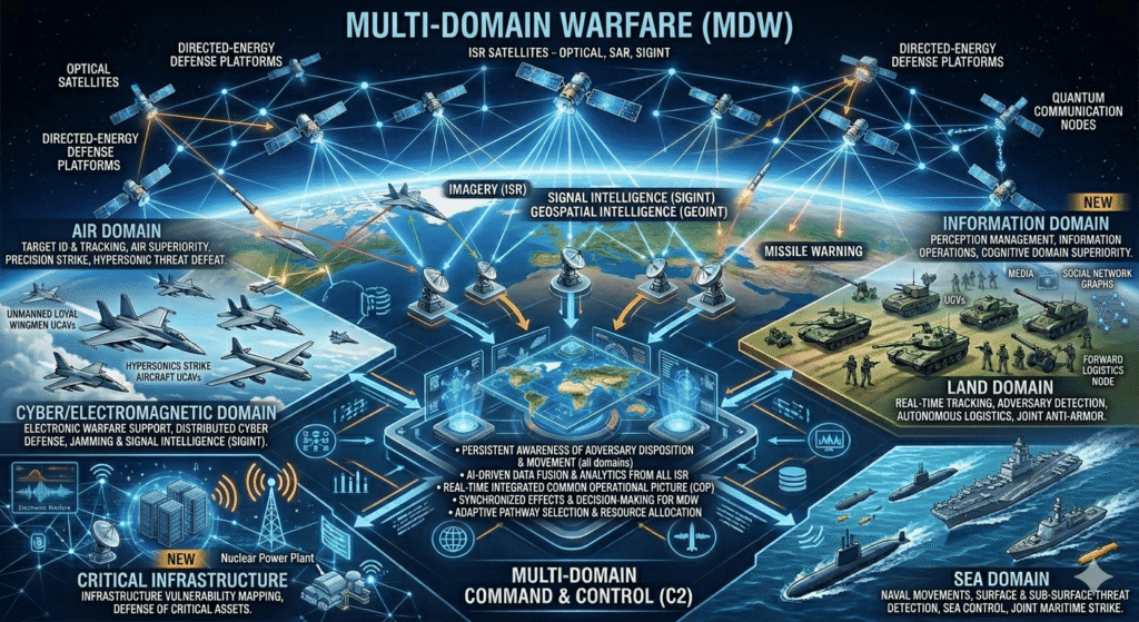 Integrated operating concept thus must emphasize high degree of situational awareness across all domains achieved through network-centric information fusion; rapid decision-making enabled by AI-assisted command systems; coordinated effects across domains executed through trained joint teams; resilience through redundant systems and graded degradation under attack; strategic depth enabling sustained operations despite initial adversary advantage.
