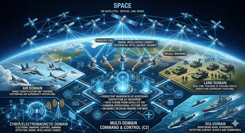 The space domain has emerged as critical enabler of multi-domain operations. Satellite-based intelligence, surveillance, and reconnaissance (ISR) provide persistent awareness of adversary force disposition and movement. Early warning systems detect missile launches and air incursions. Communication satellites enable command and control across dispersed forces. Navigation satellites (NAVIC/GPS) provide positioning for precision weapon guidance. Thus, to prioritize military space requirements is a critical strategic imperative.