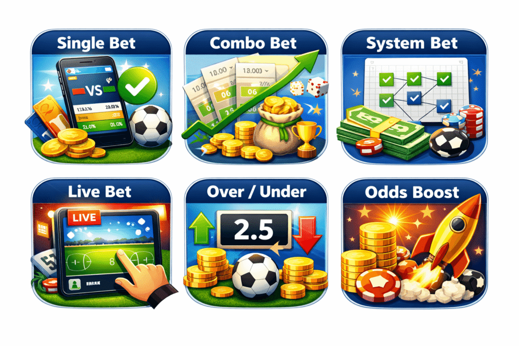 • Single Bets: As one of the simplest forms of betting, Single Bets involve placing a bet on a single outcome in an event. This type of bet is excellent for beginners.