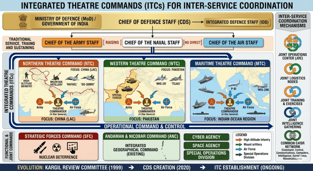 Taking cognizance of these developments, number of structural reforms have been initiated to develop and implement MDO capability within the armed forces. Towards this Ministry of Defence has declared 2025 as the “Year of Reforms,” with explicit focus on establishing Integrated Theatre Commands (ITCs) transcending traditional service boundaries. These ITCs are being structured to undertake consolidated operational planning and execution among the three services and other domains at the specific geographical theater levels to enable integration in any operational contingencies.