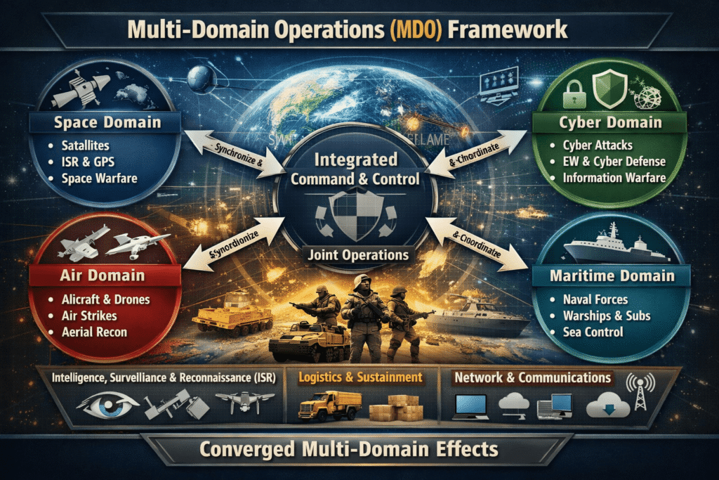 Multi-Domain Operations represent the integration of military activities across all operational domains land, sea, air, cyber, and space synchronized to achieve converging effects. This framework emerged as a response to adversaries employing sophisticated Anti-Access/Area Denial (A2/AD) systems, posing fundamental challenges to traditional joint military operations. The transformation reflects profound technological and operational realities, highlighting that future military conflicts will occur simultaneously across multiple domains, with effects in one directly influencing operations in others.