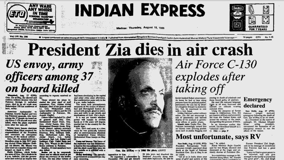 Zia died in a mysterious plane crash on 17 August 1988, along with the U.S. Ambassador to Pakistan and several senior army officials. The board of inquiry set up to investigate the crash concluded ‘the most probable cause of the crash was a criminal act of sabotage perpetrated in the aircraft’. It also suggested that poisonous gases were released which incapacitated the passengers and crew, which explains why no Mayday signal was given. Surprisingly the flight recorder (black box), usually installed in the C-130 aircraft — could not located after the crash.