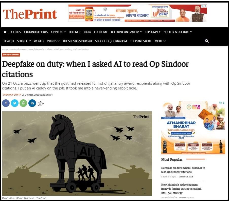 Shekhar Gupta has recently written an article ‘Deepfake on duty: when I asked AI to read Op Sindoor citations’ in The Print on Oct. 25. The deck says, “On 21 Oct, a buzz went up that the govt had released full list of gallantry award recipients along with Op Sindoor citations. I put an AI caddy on the job. It took me into a never-ending rabbit hole.”