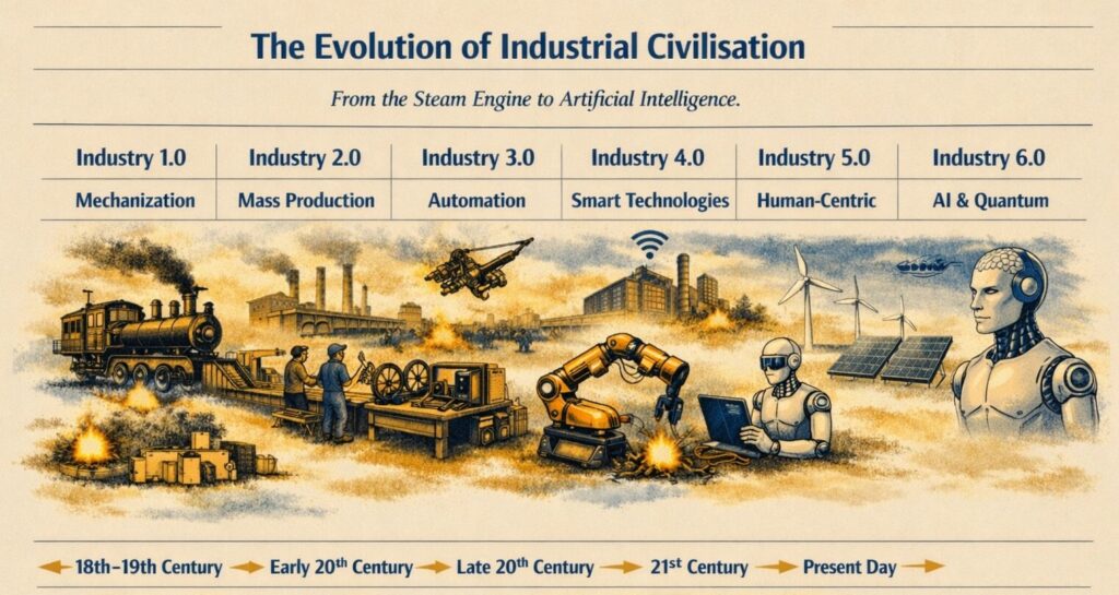 The evolution of industrial civilisation has been marked by significant transformations over time, influencing work practices, energy utilisation, and information dissemination. Currently, nations are experiencing the fourth industrial revolution, with a progression toward the fifth and sixth phases. This transition is reshaping manufacturing processes, quality assurance, and military capabilities. It involves not merely the introduction of new tools, but a comprehensive re-evaluation of the industrial system to enhance intelligence and connectivity.