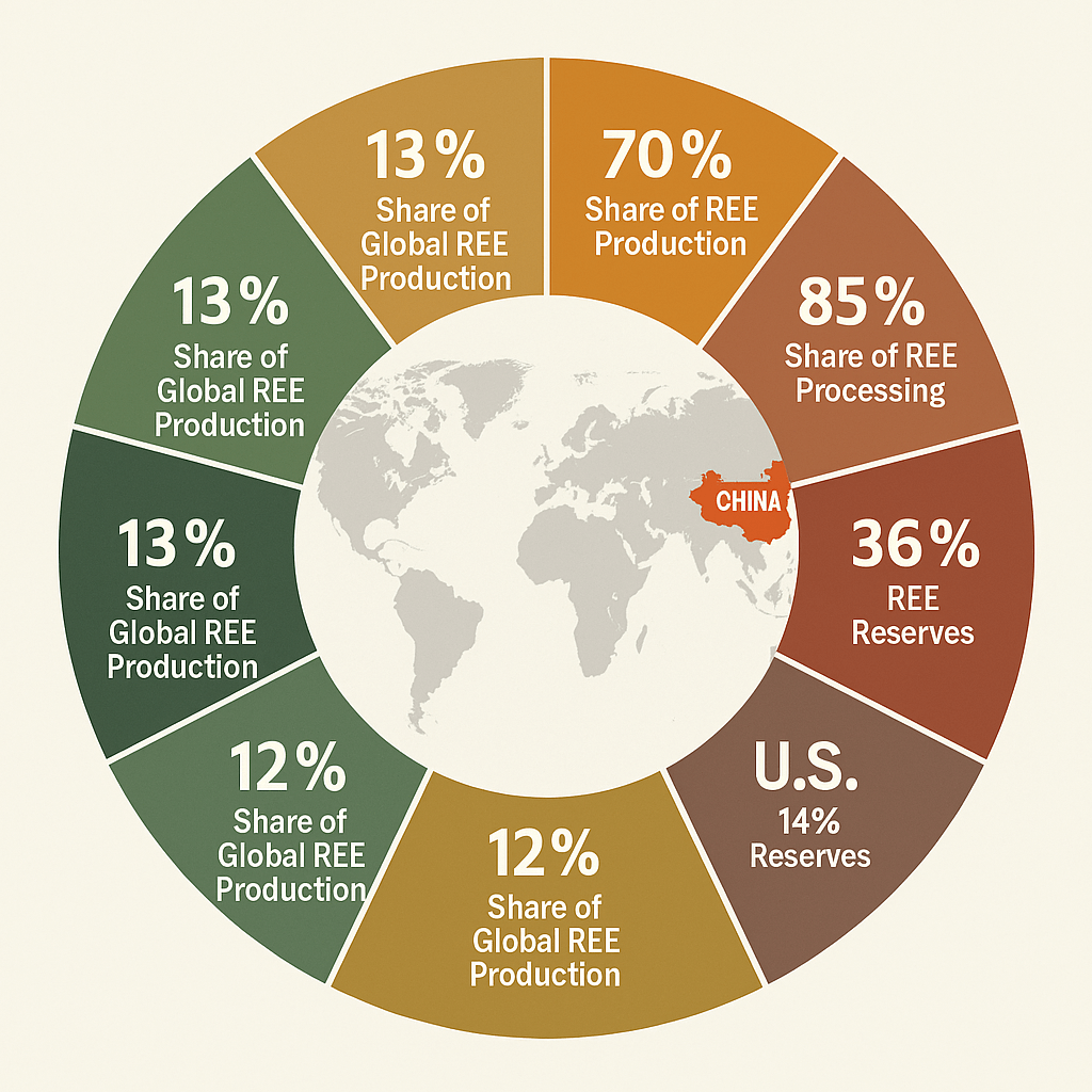 Global rare-earth reserves are estimated to be roughly 120 million metric tons of ‘rare-earth oxide’ equivalent, of this China alone controls about 49% of known deposits. China also produces 69.2% of global rare-earth output and commands 85% of global separation and refining capacity. This concentration of resource and production allows China to exert global leverage.