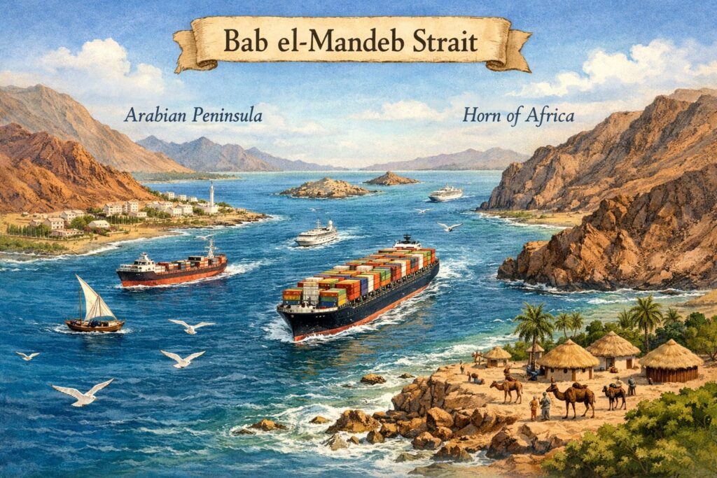 The Bab el-Mandeb Strait is a critical maritime corridor, measuring between 20 and 30 km in width and extending 70 miles in length. It serves as a geographical demarcation between Yemen on the Arabian Peninsula and Djibouti and Eritrea in Africa. This strait facilitates the connection between the Red Sea and the Gulf of Aden, linking it to the Indian Ocean. It is recognised as one of the three most significant chokepoints for global energy and trade, particularly concerning oil and liquefied natural gas (LNG) shipments. Furthermore, the strait provides a conduit from the Indian Ocean to the Mediterranean Sea through the Suez Canal. Approximately over 10% of the world’s seaborne oil and a quarter of all global shipping transits through this passage. The strait is colloquially referred to as the “Gate of Tears” or “Gate of Grief” due to its narrowness and navigational challenges. Perim Island, located within Yemeni territory, divides the strait into two distinct channels: the eastern channel, approximately 2 miles wide, accommodates outbound vessels, and the western channel, approximately 16 miles wide, is designated for inbound traffic. The strait is not under the jurisdiction of any single nation, rendering it susceptible to security threats, including terrorism and regional conflicts such as Houthi attacks on maritime vessels. The considerable depth of the strait, often exceeding 200 m, is advantageous for the passage of large ships. Additionally, they play a significant role in influencing tidal and oceanic currents.